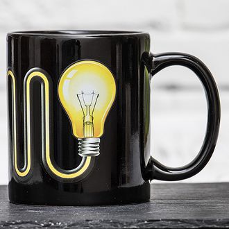Оригинальная термо-кружка, с изображением лампочки поднимет вам настроение и сообщит о температуре вашего напитка. Когда вы наливаете в эту кружку чай или кофе, лампочка, которая нарисована на поверхности начинает "разгораться". Как только напиток остывает или когда вы его выпили, лампочка снова "гаснет". Теперь благодаря этому несложному индикатору вы всегда в курсе насколько горяч ваш напиток.