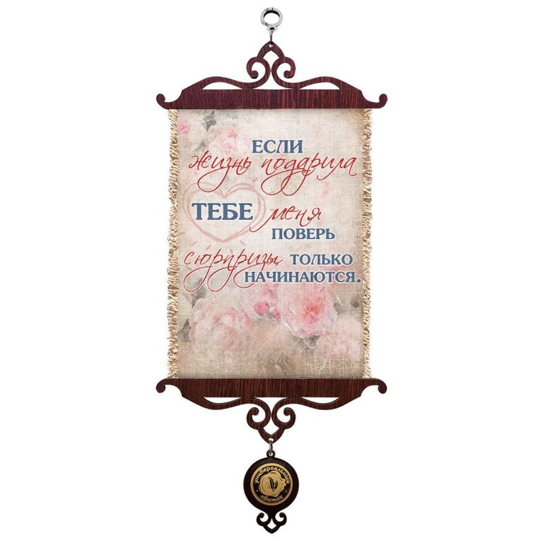 Сувенир вертикальный - это синтез креатива, оригинальности, практичности и доступности. Специальная технология нанесения на льняную ткань и бахрома по краям превращают изображение в фактурный свиток, а обожжённая деревянная рея в сочетании с тесьмой из плотной мешковины и джутовым шпагатом, преобразуют свиток в оригинальное панно. Он защищен специальным лаком от внешней среды. Долговечен, как и положено изделию под старину, но при этом его стиль не подвластен времени. Это модная новинка, которая одинаково прекрасно вписывается в интерьер загородного дома, дачного домика, бани, квартиры или офиса. Его актуальность сложно переоценить. Его мудрые цитаты, афоризмы, пожелания или шуточные высказывания ненавязчиво дополняют собой пространство, положительно влияя на его атмосферу и имидж своего обладателя. Прекрасный подарок по любому поводу и без.