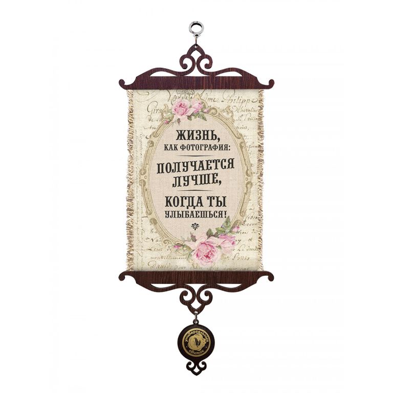 Сувенир вертикальный - это синтез креатива, оригинальности, практичности и доступности. Специальная технология нанесения на льняную ткань и бахрома по краям превращают изображение в фактурный свиток, а обожжённая деревянная рея в сочетании с тесьмой из плотной мешковины и джутовым шпагатом, преобразуют свиток в оригинальное панно. Он защищен специальным лаком от внешней среды. Долговечен, как и положено изделию под старину, но при этом его стиль не подвластен времени. Это модная новинка, которая одинаково прекрасно вписывается в интерьер загородного дома, дачного домика, бани, квартиры или офиса. Его актуальность сложно переоценить. Его мудрые цитаты, афоризмы, пожелания или шуточные высказывания ненавязчиво дополняют собой пространство, положительно влияя на его атмосферу и имидж своего обладателя. Прекрасный подарок по любому поводу и без.