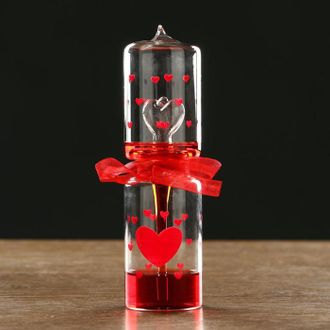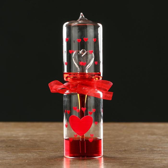Тепловой фонтан — стеклянный сосуд, который состоит из 2 частей. Нижняя выполнена в форме капли и наполнена цветной жидкостью, верхняя — пустая, сделана в форме сердца. Стоит взять фонтан в руку, жидкость нагревается от тепла ладони, поднимается и заполняет «сердце». Выглядит как настоящее волшебство, как будто вы двигаете жидкость силой своей любви.