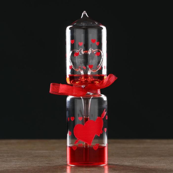 Тепловой фонтан — стеклянный сосуд, который состоит из 2 частей. Нижняя выполнена в форме капли и наполнена цветной жидкостью, верхняя — пустая, сделана в форме сердца. Стоит взять фонтан в руку, жидкость нагревается от тепла ладони, поднимается и заполняет «сердце». Выглядит как настоящее волшебство, как будто вы двигаете жидкость силой своей любви.
