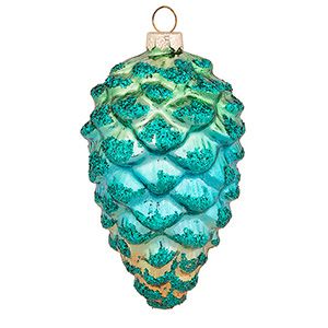 Стеклянная шишка из коллекции новогодних и рождественских украшений Holiday Classics. Каждое из изделий коллекции состоит из множества продуманных деталей декора, в данном случае яркие бирюзово-зелёные тона со значительной примесью золота, окутанные искрящимся глиттером являются проводниками в мир новогодней мечты.