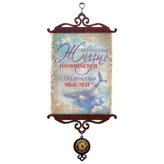 Сувенир вертикальный - это синтез креатива, оригинальности, практичности и доступности. Специальная технология нанесения на льняную ткань и бахрома по краям превращают изображение в фактурный свиток, а обожжённая деревянная рея в сочетании с тесьмой из плотной мешковины и джутовым шпагатом, преобразуют свиток в оригинальное панно. Он защищен специальным лаком от внешней среды. Долговечен, как и положено изделию под старину, но при этом его стиль не подвластен времени. Это модная новинка, которая одинаково прекрасно вписывается в интерьер загородного дома, дачного домика, бани, квартиры или офиса. Его актуальность сложно переоценить. Его мудрые цитаты, афоризмы, пожелания или шуточные высказывания ненавязчиво дополняют собой пространство, положительно влияя на его атмосферу и имидж своего обладателя. Прекрасный подарок по любому поводу и без.